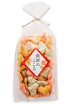 ひとつひとつがかわいいハート形の美味しいしょう油味のあられです。『感謝のこころ』のシールが貼られています。こちらの商品は、バレンタインの時期以外にも《お礼の気持ち》を年間を通じて御利用下さい。